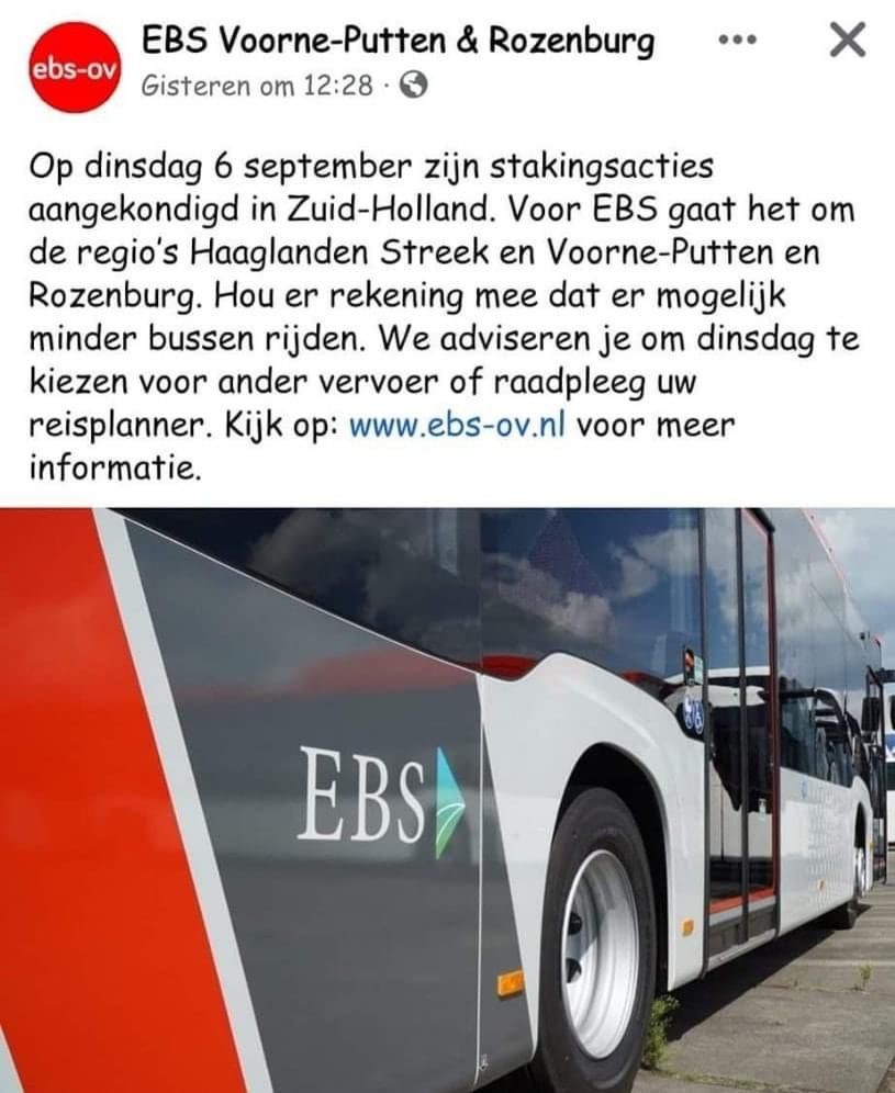 Morgen, dinsdag 6 september, staakt naar alle waarschijnlijkheid het streekvervoer in Zuid-Holland. Een deel van de bussen van EBS op Voorne-Putten zal dan naar verwachting niet rijden, meld de EBS-website.