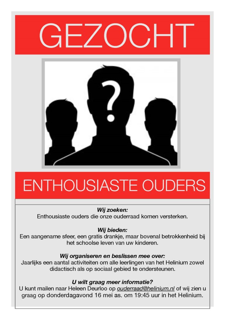 U kunt mailen naar Heleen Deurloo op ouderraad@helinium.nl, of wij zien u graag op donderdagavond 16 mei a.s. om 19.45 uur in het Helinium.