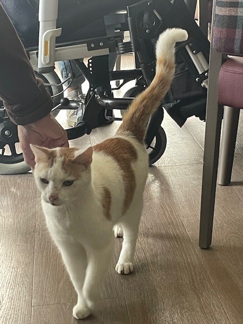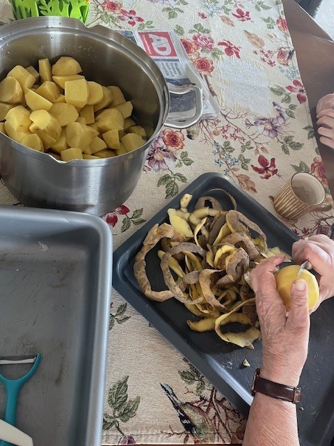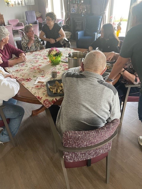 De leerlingen hebben een kopje koffie gedronken met de bewoners. Zo zagen ze dat de bewoners kleine huishoudelijke klusjes mogen doen, zoals samen aardappels schillen of de was vouwen. Het is gezellig en geeft de bewoners structuur. Ook Dirk de huiskat was deze keer weer van de partij😊